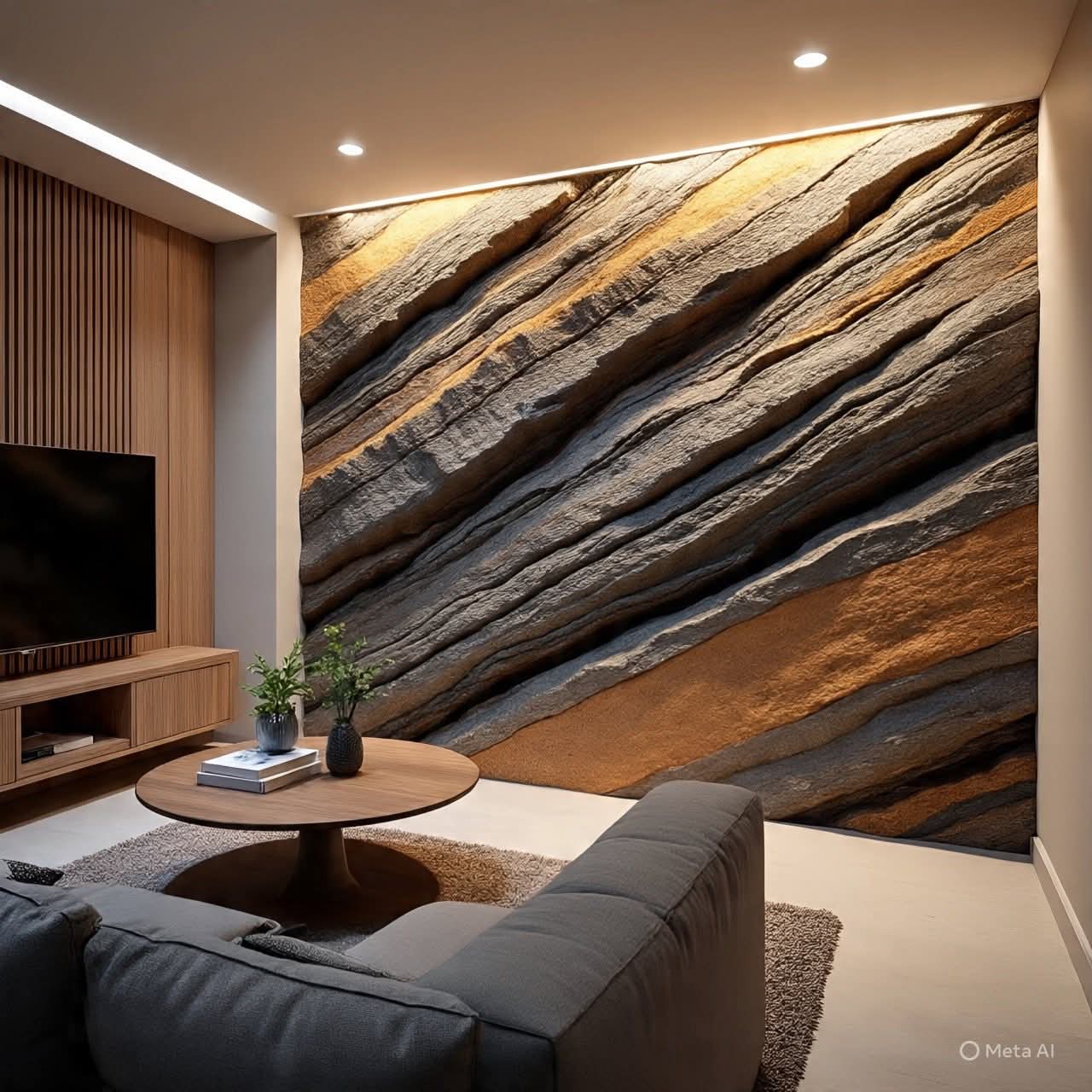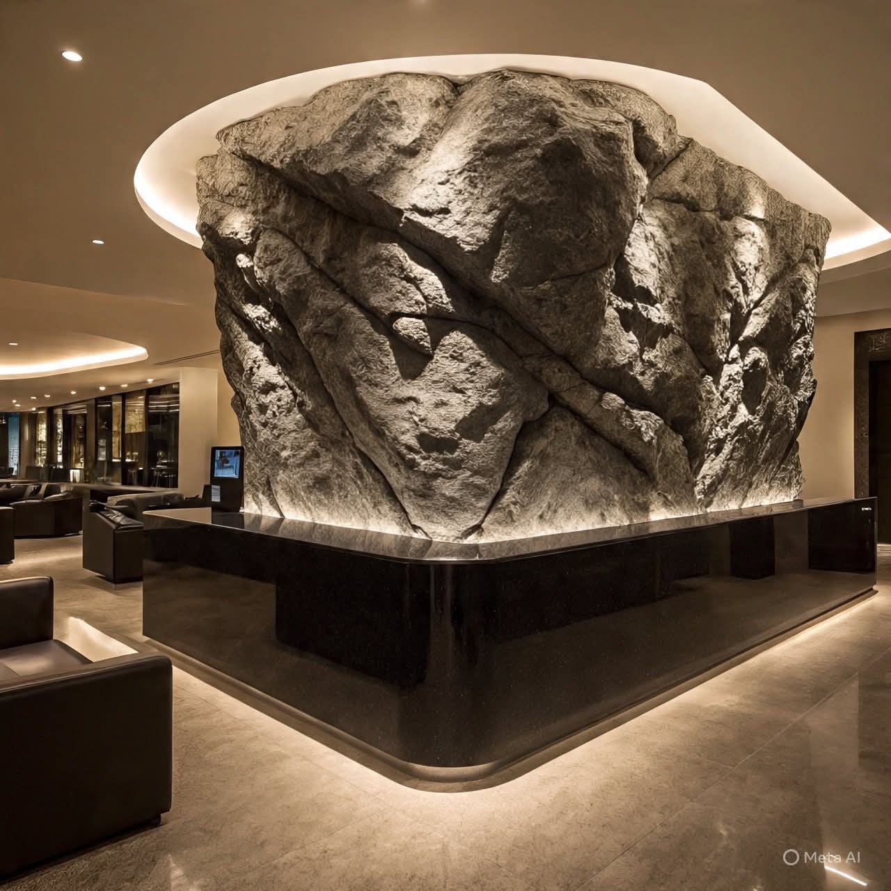 Een imitatie rotswand brengt de sfeer van natuursteen naar binnen, zonder het gewicht of de beperking van echt gesteente.